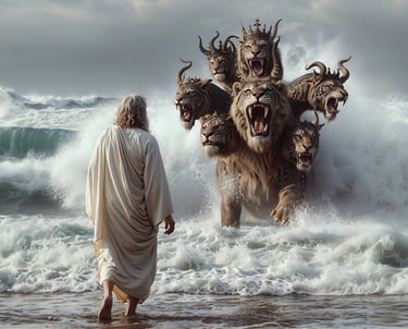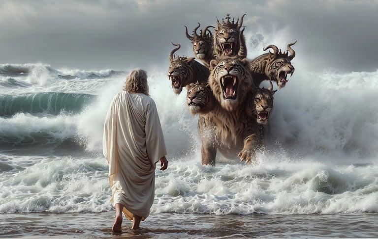 VERSE 1. And I stood upon the sand of the sea, and saw a beast rise up out of the sea, having seven heads and ten horns, and upon his horns ten crowns, and upon his heads the name of blasphemy. 2. And the beast which I saw was like unto a leopard, and his feet were as the feet of a bear, and his mouth as the mouth of a lion: and the dragon gave him his power, and his seat, and great authority. 3. And I saw one of his heads as it were wounded to death; and his deadly wound was healed: and all the world wondered after the beast. 4. And they worshiped the dragon which gave power unto the beast: and they worshiped the beast, saying, Who is like unto the beast? Who is able to make war with him? 5. And there was given unto him a mouth speaking great things and blasphemies; and power was given unto him to continue forty and two months. 6. And he opened his mouth in blasphemy against God, to blaspheme his name, and his tabernacle, and them that dwell in heaven. 7. And it was given unto him to make war with the saints, and to overcome them: and power was given him over all kindreds, and tongues, and nations. 8. And all that dwell upon the earth shall worship him, whose names are not written in the book of life of the Lamb slain from the foundation of the world. 9. If any man have an ear, let him hear. 10. He that leadeth into captivity shall go into captivity: he that killeth with the sword must be killed with the sword. Here is the patience and the faith of the saints.